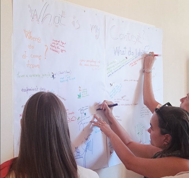 La scuola si è svolta a Kalentzi (Grecia), luogo estremamente interessante per il suo ecosistema cooperativo in crescita, che comprende iniziative come Tzoumakers, un makerspace rurale; Nea Guinea (Scuola della Terra), dedicata a stili di vita sostenibili; High Mountains, una cooperativa agricola sociale; Boulouki, un collettivo di costruttori vernacolari impegnato nella salvaguardia delle tecniche tradizionali di costruzione; e Habibi.Works, un makerspace interculturale ed educativo a sostegno di rifugiati. Conoscere questa rete di collettivi che operano sul territorio è stato fondamentale per concretizzare e sperimentare i contenuti teorici della scuola. Le partecipanti erano un mix di accademiche in diverse fasi della loro vita, attiviste, militanti e persone coinvolte in diversi ambiti della post-crescita in diversi luoghi del mondo. Questa diversità ha apportato una ricchezza di prospettive unica e necessaria per disimparare e co-imparare.